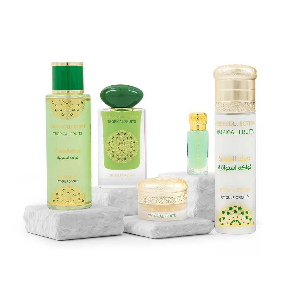 Plongez dans un univers exotique avec le pack Gulf Orchid Musk Collection Tropical Fruits, une célébration de la fraîcheur tropicale mêlée au musc solaire.
